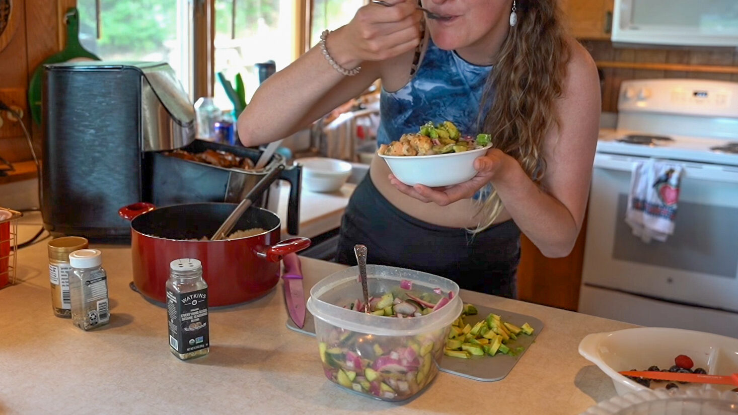 Layer in chopped avocado and a generous scoop of the chilled onion and cucumber mix for crunch and freshness. Spoon the cooked salmon over the top.