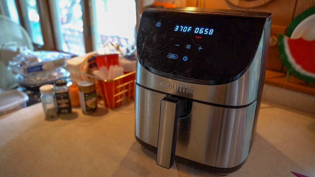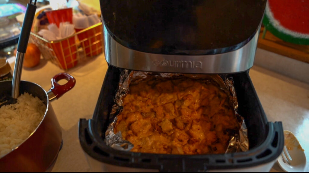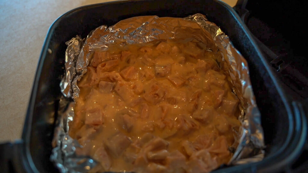 Strain off some of the excess liquid and transfer the coated salmon into an air fryer basket lined with aluminum foil.