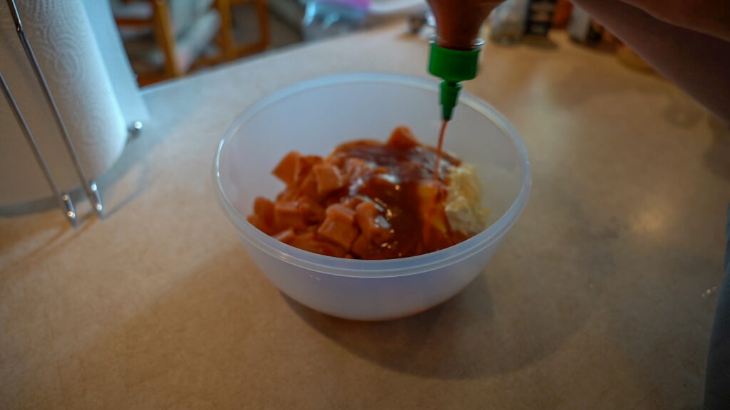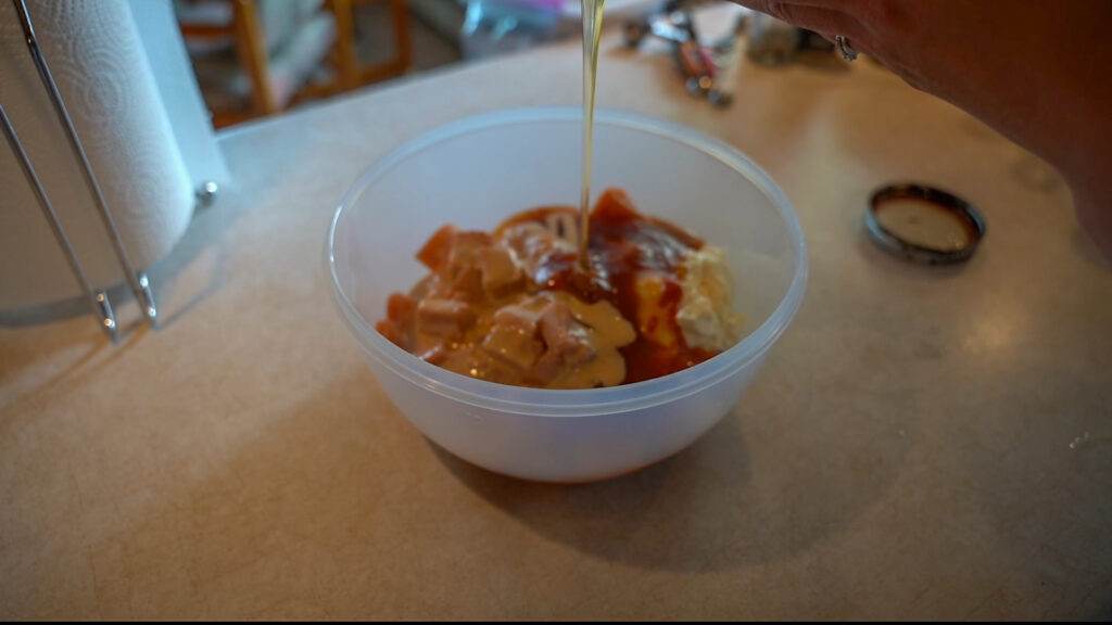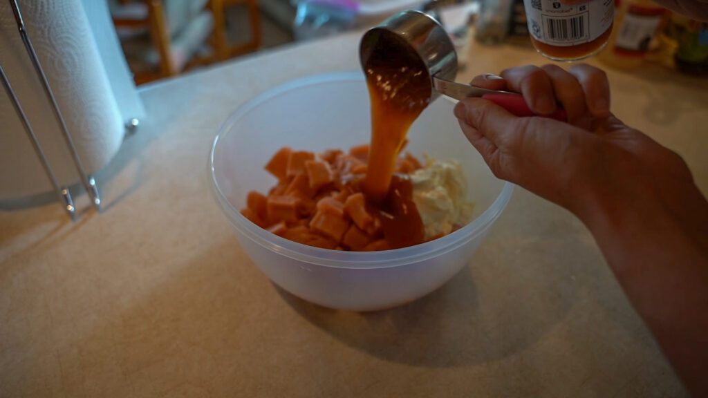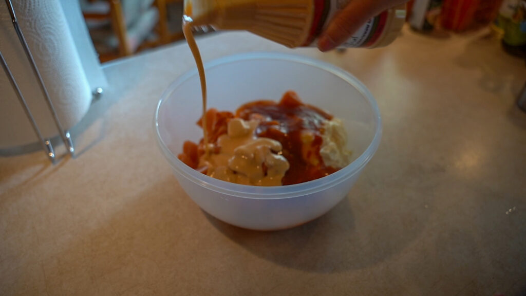 In a separate bowl, combine the mayonnaise, Thai sweet chili sauce, sriracha, honey, and Yum Yum sauce to make the sauce mixture. Gently fold the salmon into the mixture until evenly coated.
