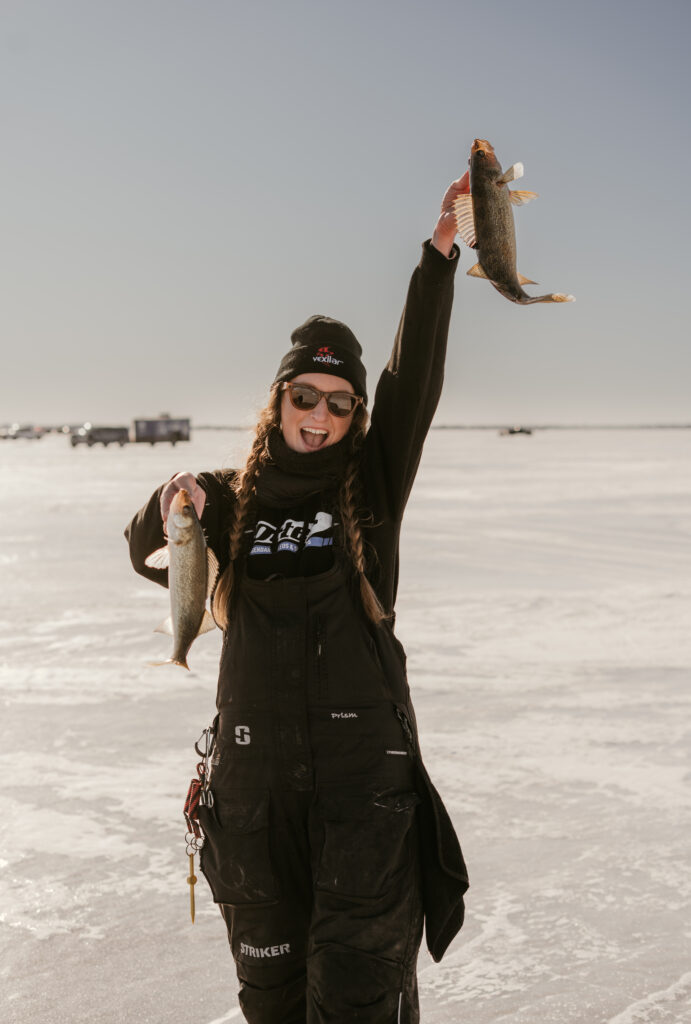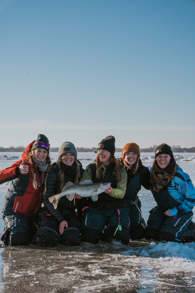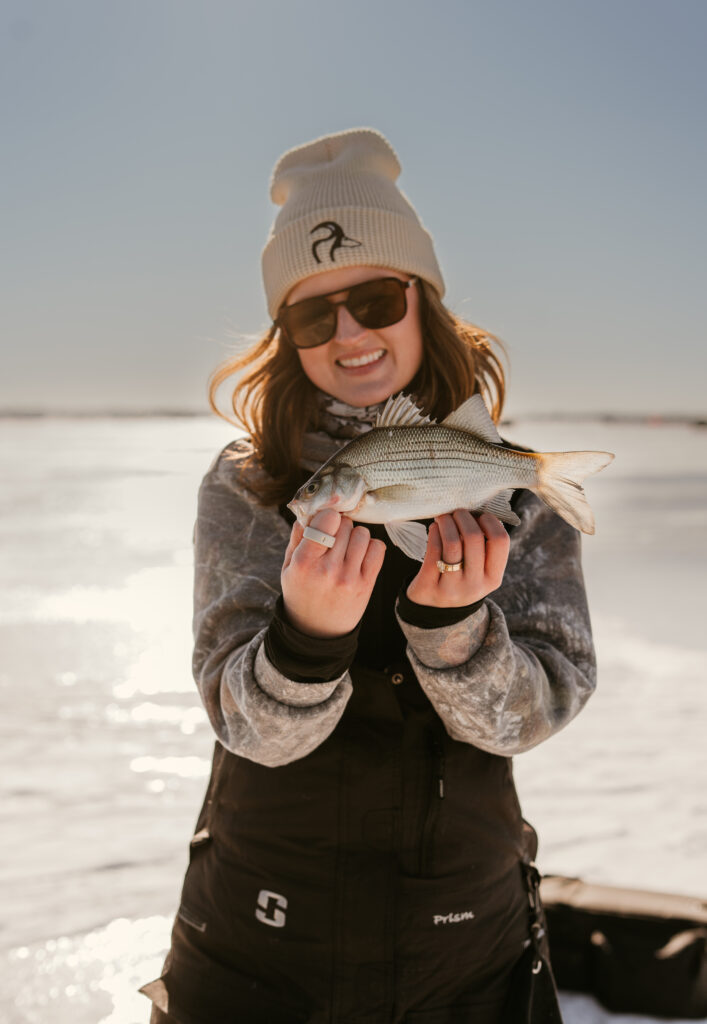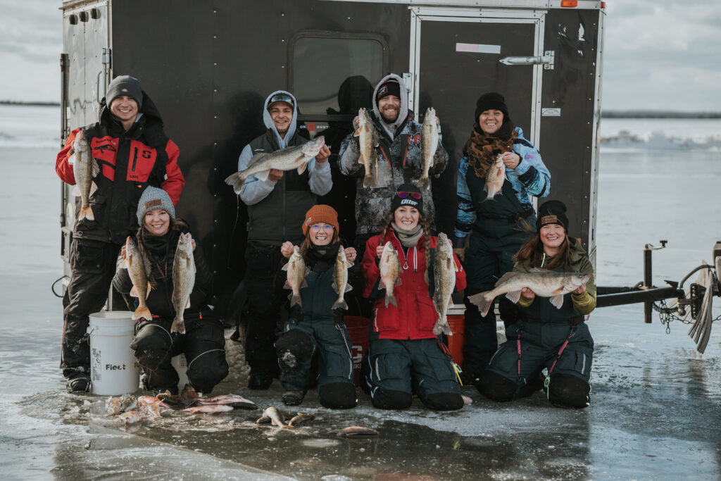 Molly, TT, and TW moved in first and all caught white bass to help fill tickets. As Jimmy and Dori were pulling up in their side-by-side and getting out, I hooked into a second walleye. They watched me land it right there, popping it off at the hole and having to go wrist-deep to get him. By then, we already knew through texts that we had enough fish between us to cover tickets across the group.