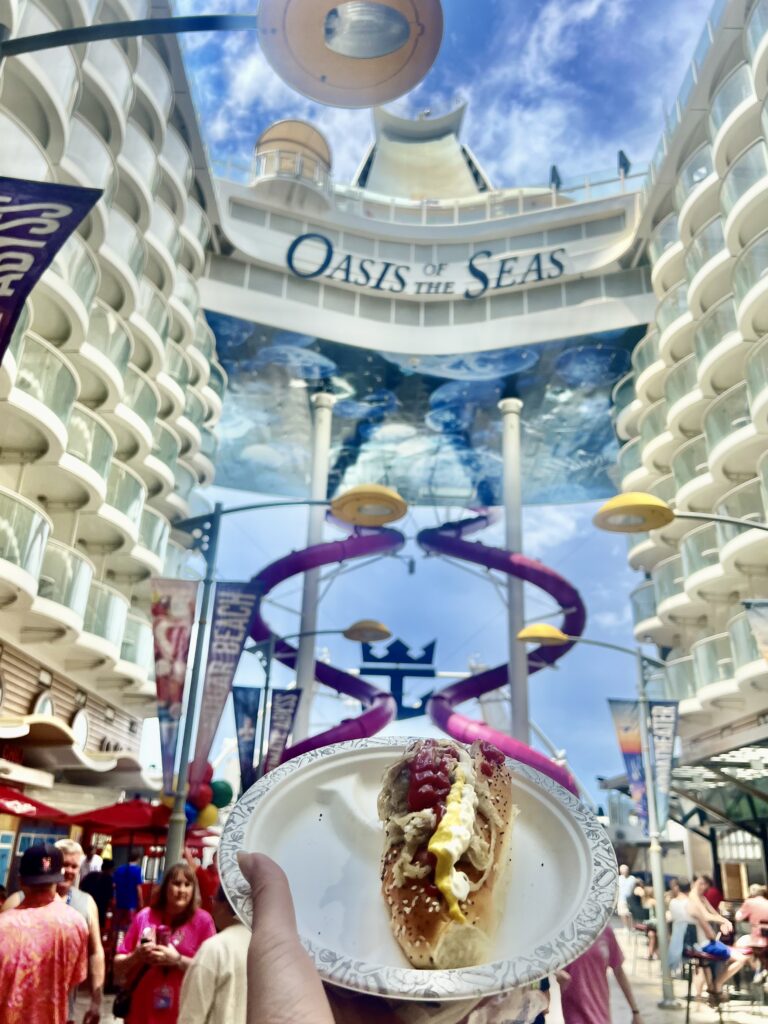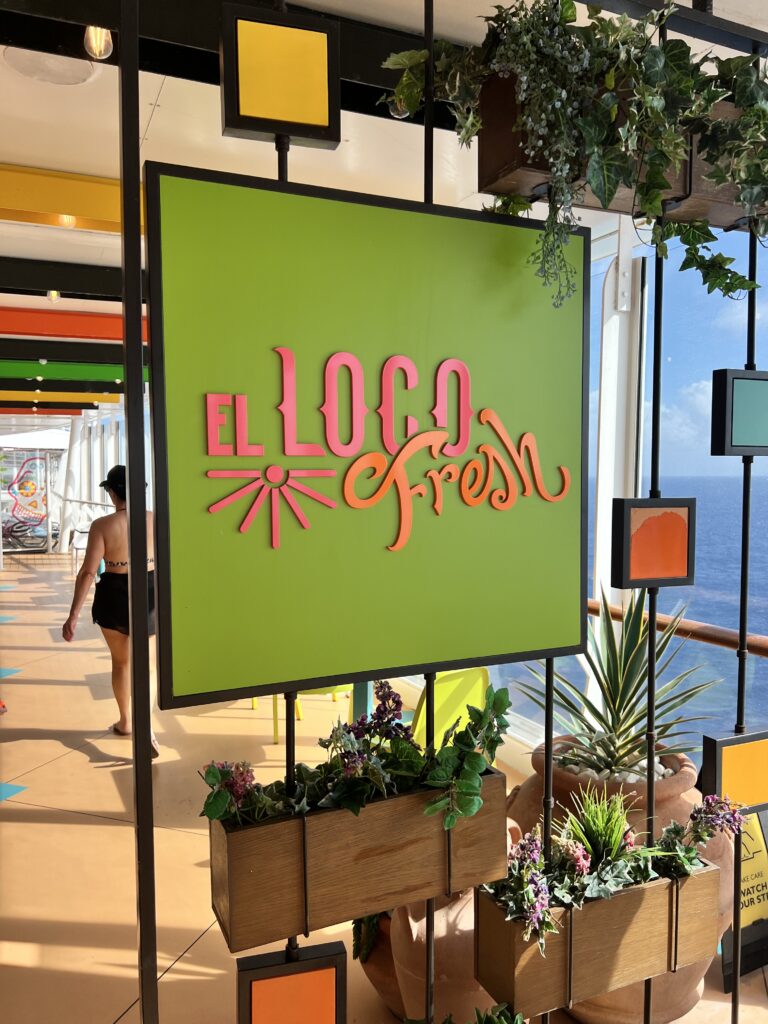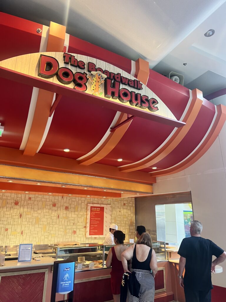 Food became its own routine too. We ate at a handful of different spots depending on what sounded good at the moment. The Boardwalk Dog House became a daily stop. We started calling them “glizzies at sea” and somehow that just stuck. El Loco Fresh was another favorite, quick tacos, burritos, nachos, really fresh and easy. Café Promenade was always there for wraps, desserts, coffee, and snacks whenever we felt like grabbing something in between. Every single night, without fail, we ended up at Sorrento’s for pizza before bed.