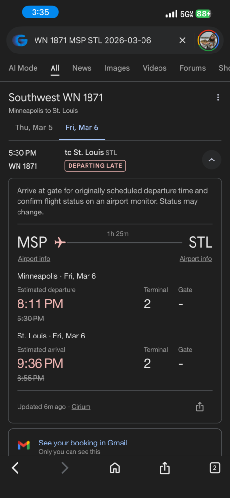 From there it was a scramble. We wrapped up what we could, left immediately, got to parking, got to the airport, and went straight to the Southwest counter in Terminal 2. They told us what we already knew. That was the only option. We could maybe get to St. Louis, but then we’d still have to somehow get ourselves to Fort Lauderdale. That wasn’t going to work.