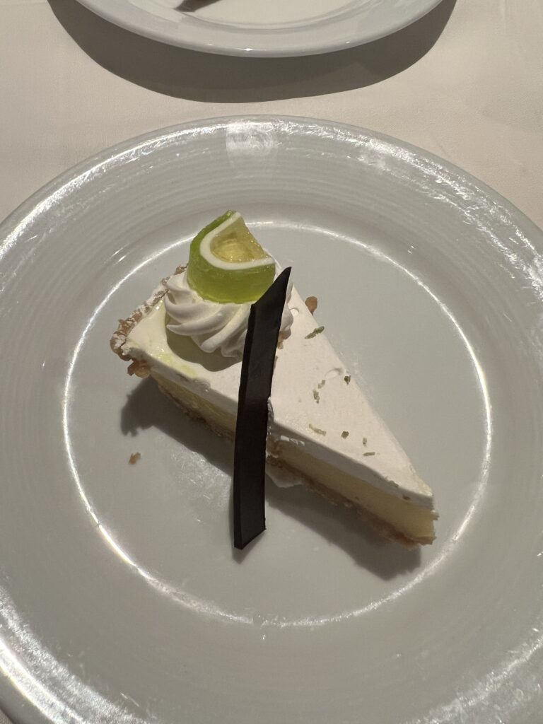 Dinner was unreal. Shrimp cocktail, crab cakes, ribeye for me with a baked potato and vegetables, prime rib for Jay with mashed potatoes, and of course dessert because we’re not skipping that on a cruise. Key lime pie for me, strawberry cheesecake for him. It was one of those meals where you just sit there thinking, yeah… this is exactly what we needed. Our server team Aditya and Peter were also honorable mentions. Incredible folks; they were both mentioning how they were so excited that they had only a few weeks left on Oasis before a much needed break to come. They had been aboard for 8 months already!