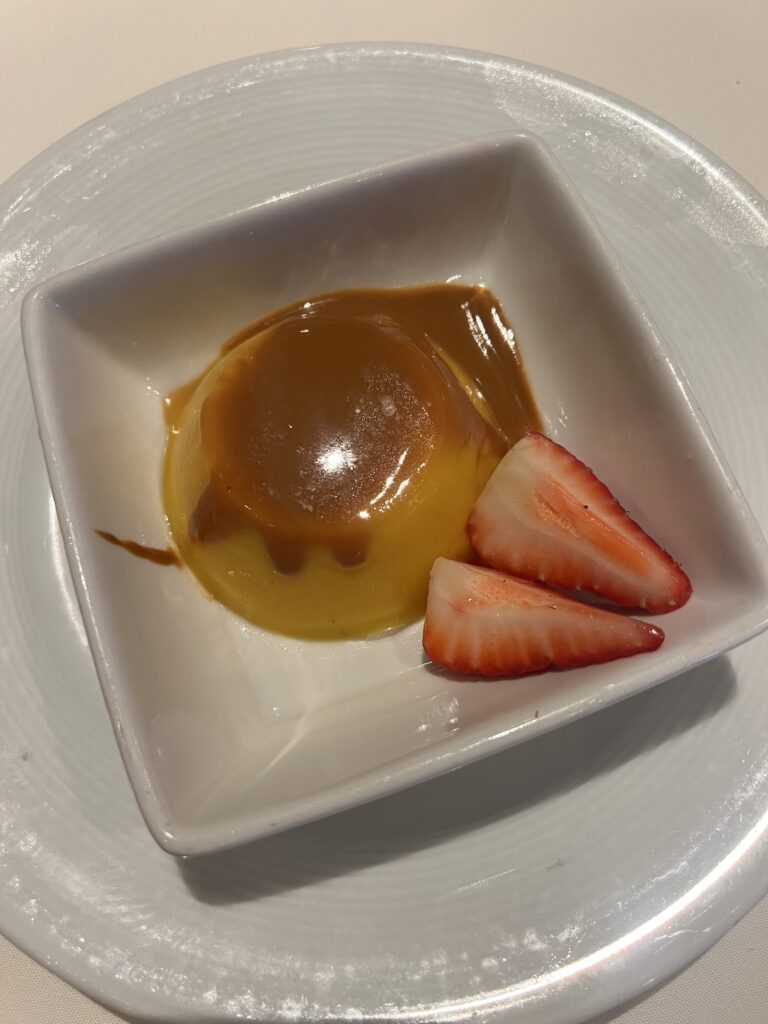That night we had calamari, French onion soup that was unreal, seafood linguine for me, red curry for Jay, and crème brûlée for dessert. Night 3 was more of a Latin theme, where I had a Cajun salmon dish with mango salsa, Jay had Cajun chicken, and we finished it off with flan and tres leches.