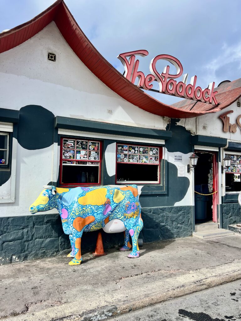 From there we wandered through Oranjestad, just kind of letting the morning unfold. There were boutique stores, designer labels, casinos, hotels, diamond stores, watch shops, and all of it sitting against that bright, colorful Caribbean backdrop. We weren’t really there to shop, so we mostly just looked, took pictures, and kept walking. There were these cute little cow sculptures scattered around that I loved, so naturally we stopped for photos with those too. It was one of those mornings where nothing felt rushed and everything felt worth noticing.