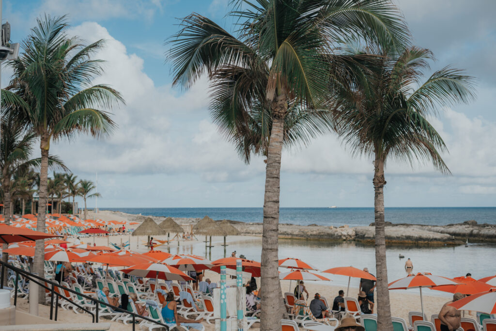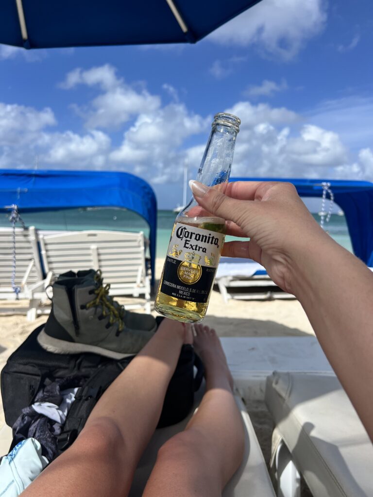 At some point we had walked probably two and a half miles and found ourselves heading toward a stretch of beach where we spotted umbrellas and figured that had to mean drinks and somewhere to sit. That brought us to Reflexion Bar and Beach Club, where we grabbed a couple Coronas, found beach chairs, and made our way into the ocean for a bit. It was warm, easy, and exactly the kind of “we’re really here” moment that makes a port day feel real. We eventually got approached and told the chairs were something you had to pay for, which we hadn’t realized, but we weren’t planning to stay long anyway and they were really nice about letting us just hang out for a bit. One of those small little moments of grace that you appreciate when you’re traveling.