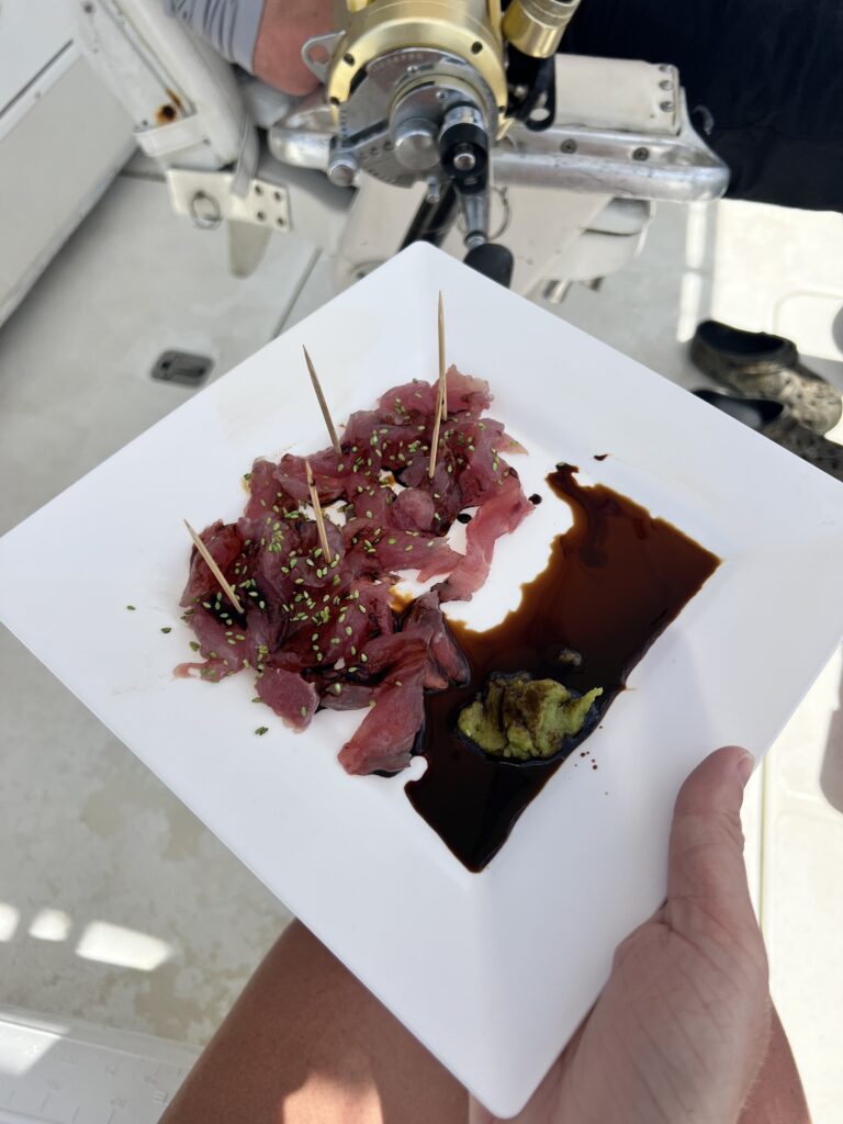 At one point on the way back in, Douglas cut up some of the tuna and made sashimi right there on the boat, which was unreal. Fresh, simple, and one of those experiences that just sticks with you. We didn’t take fish back with us since we were heading back to the cruise, but they explained how it usually works for clients, which was interesting to hear.
