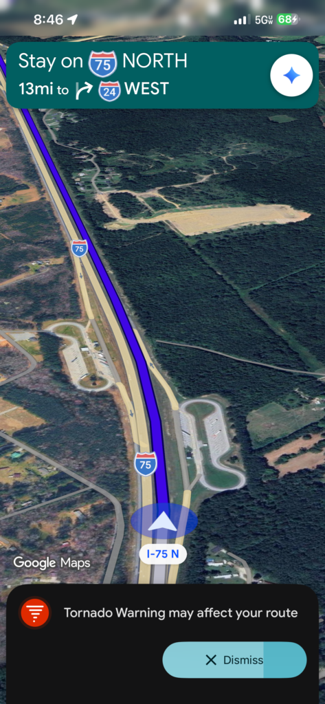 From there, it was just survival mode. Driving, stopping, trying to rest, getting back on the road again. I drove most of it because even though I wasn’t feeling great, I knew I could keep us moving as long as I stayed awake. Jay took over everything else, looking at routes, checking flights, weather, figuring out next steps.