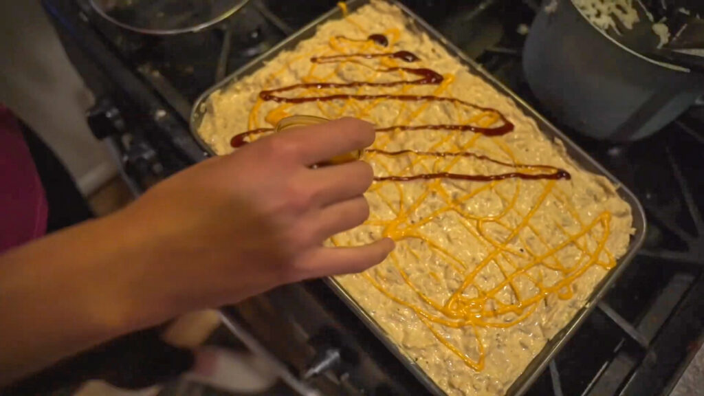 Add the salmon mixture on top and smooth it out. Drizzle with sriracha mayonnaise, eel or sushi sauce, and sprinkle with furikake seasoning.