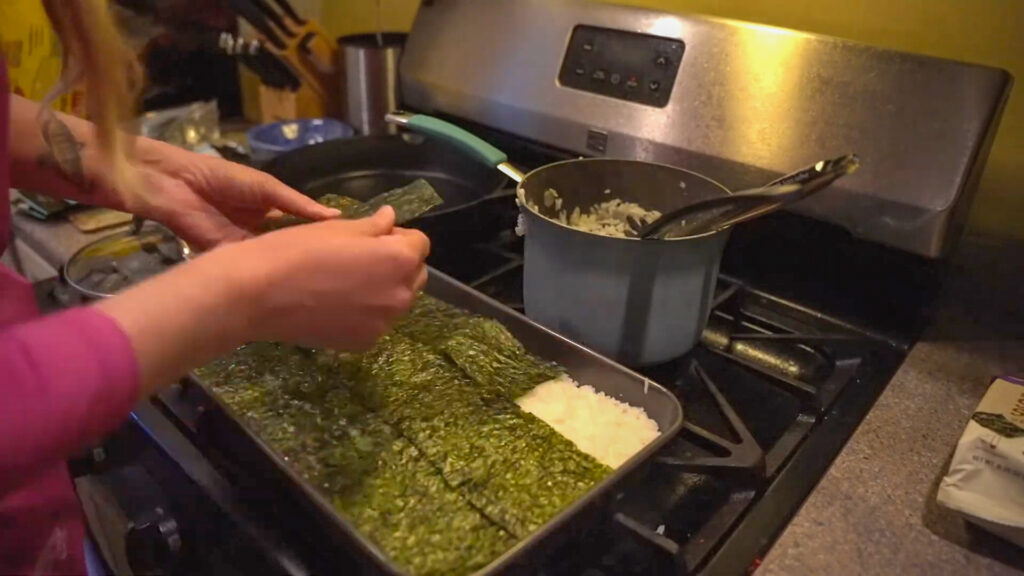 Spoon the cooked rice into a deep baking dish, filling it about halfway. Spread it evenly and smooth the top. Layer nori sheets over the rice until fully covered.