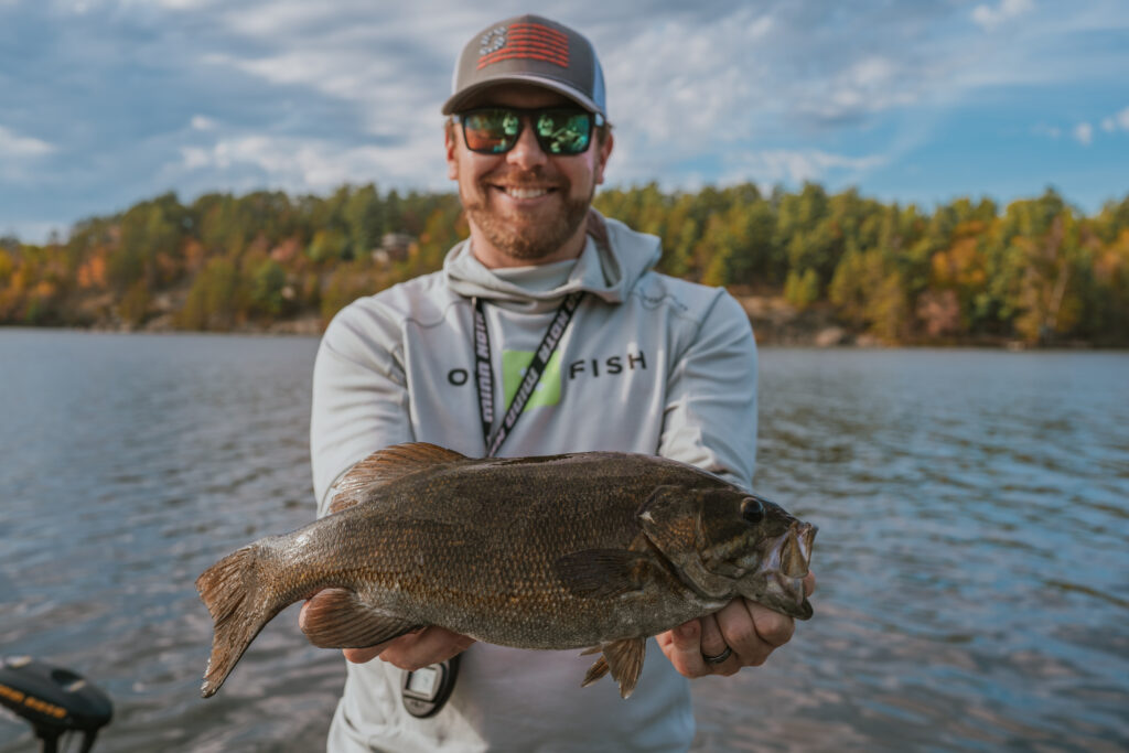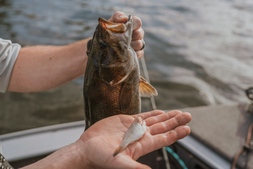 Once we unpacked, we launched the boat and headed for Black Bay. The wind was up and we marked fish, but our catches were small. We moved behind an island and found a downed tree holding perch and smallmouth. The bite was slow but steady. It was a relaxing way to start. Jay caught a solid smallie.