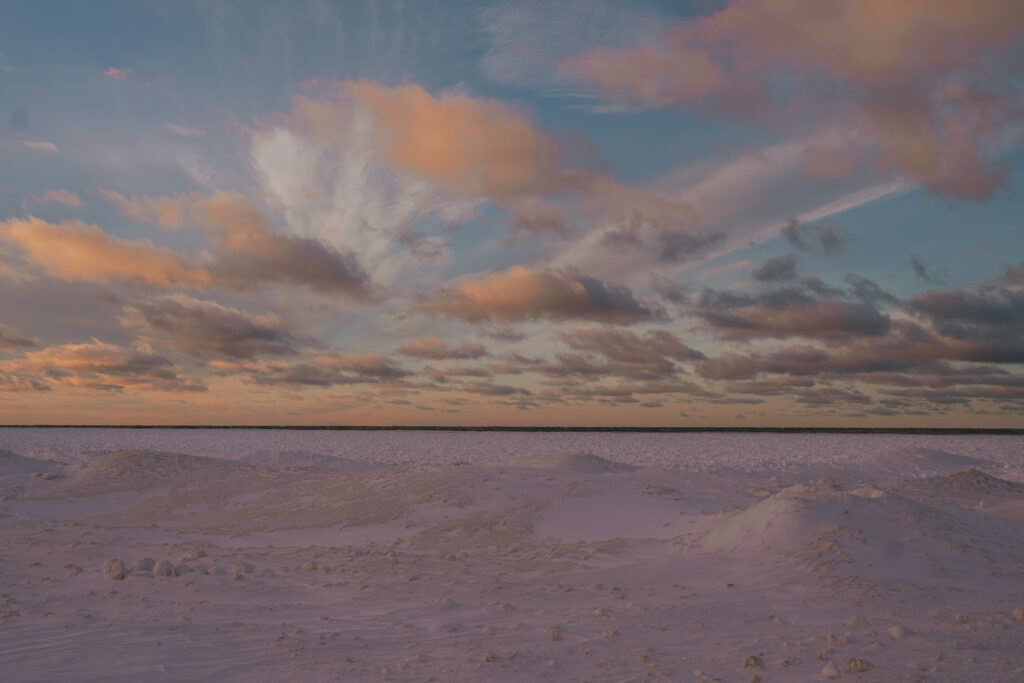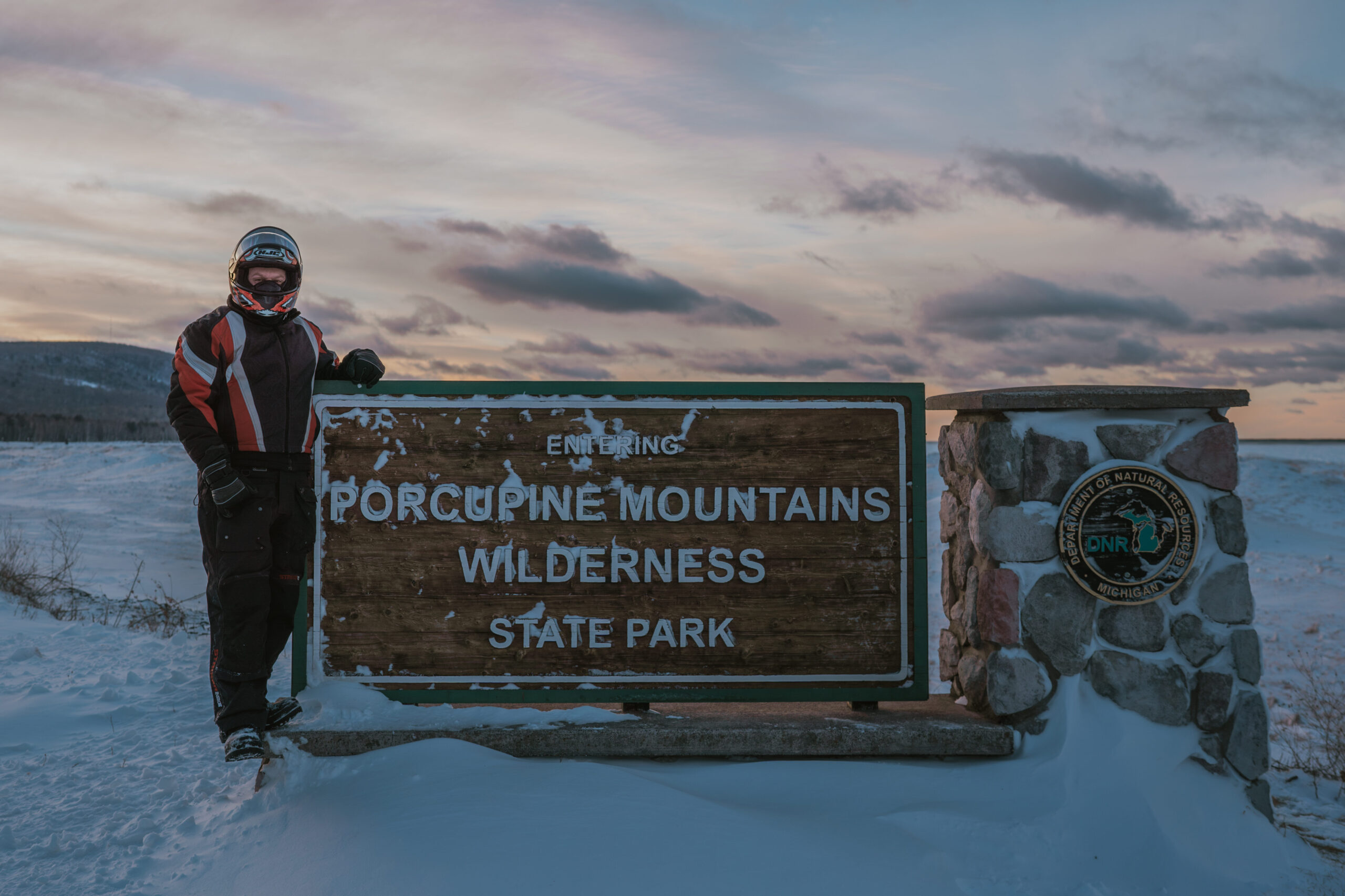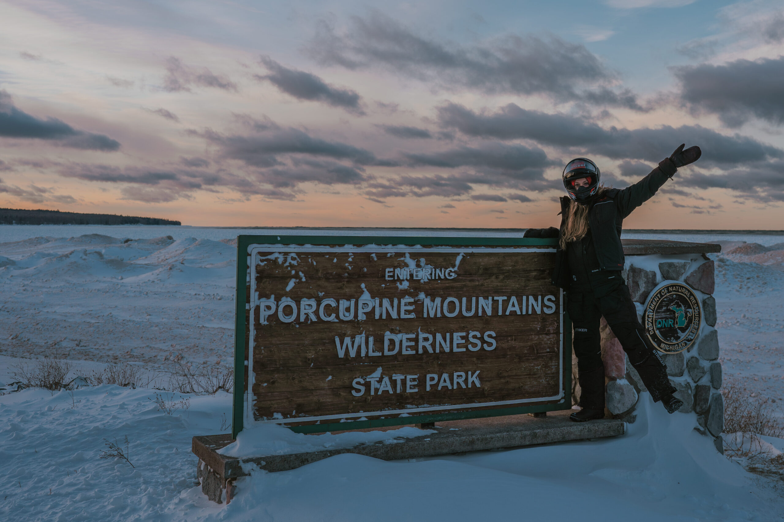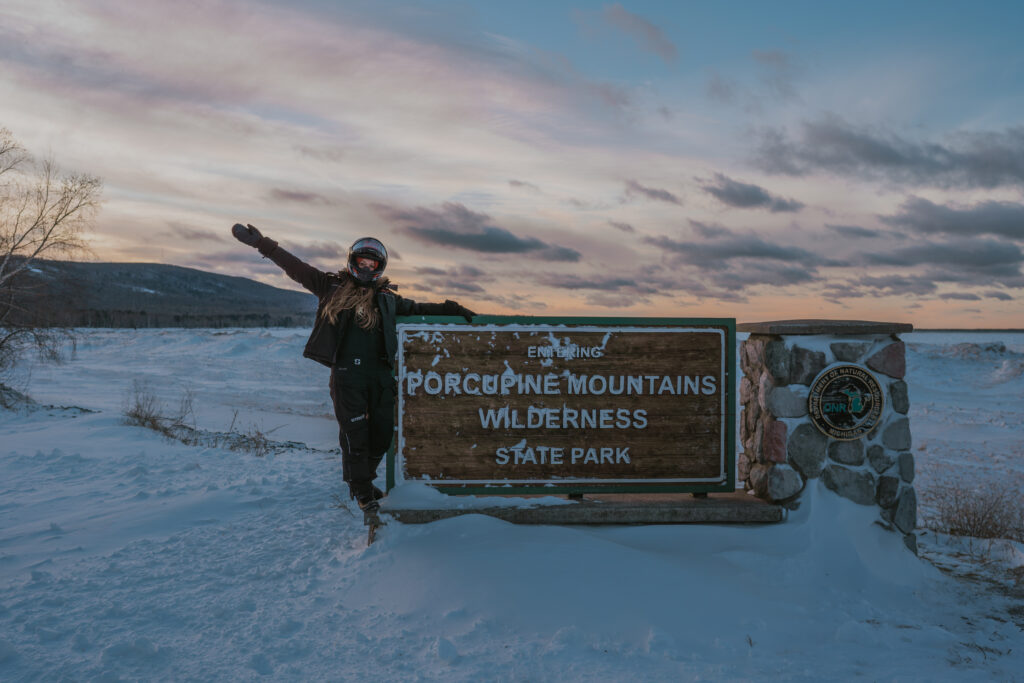 We rode back to our trailer, but not without stopping by the infamous Porkies sign and taking in some views of icy Lake Superior. The sunset only got prettier by the minute.