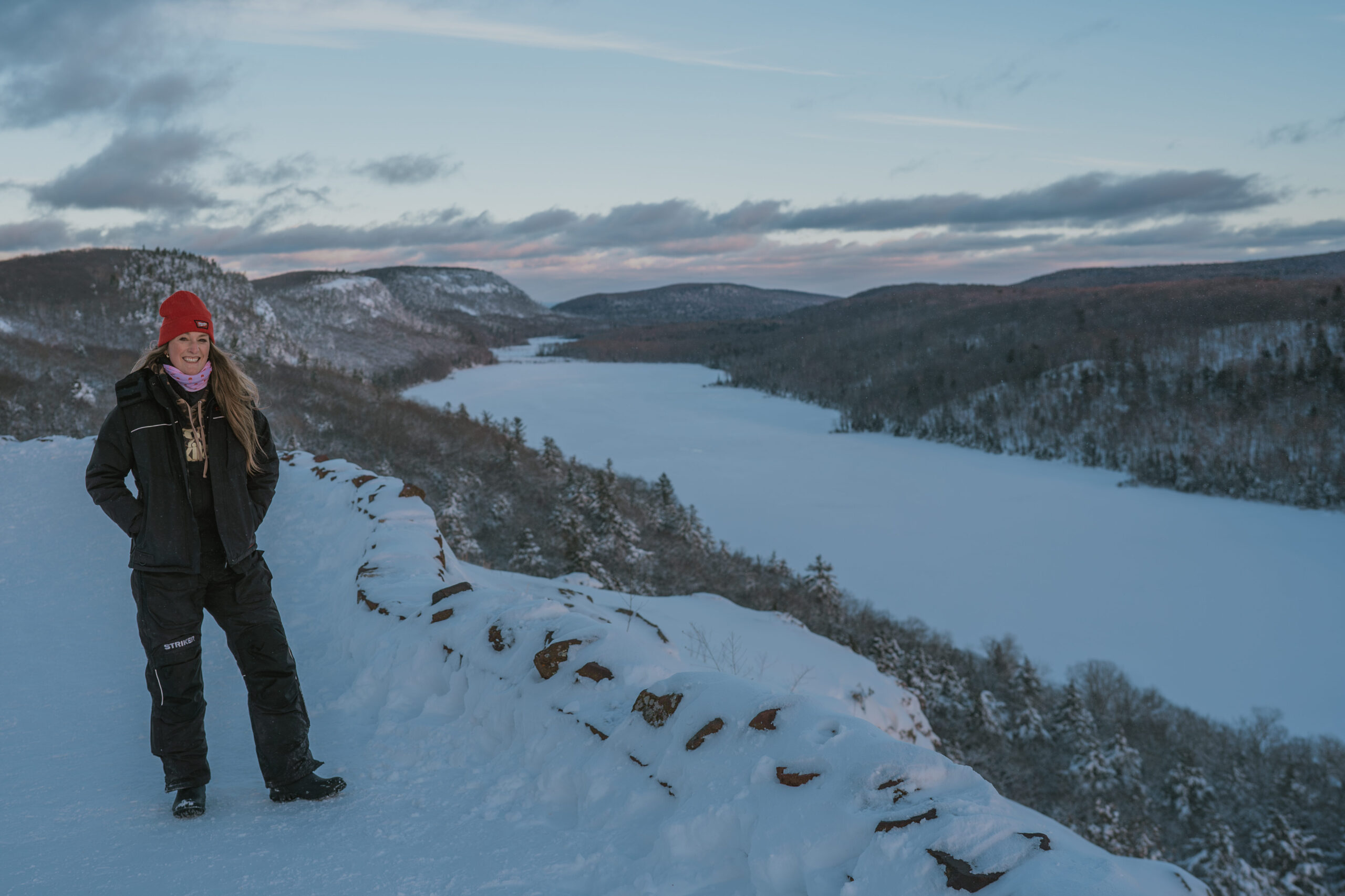 We arrived just in time for sunset and stood at the overlook watching the sky shift colors over the valley below. The Big Carp River winds through the landscape beneath the overlook, frozen and quiet, adding to the sense of scale and stillness.