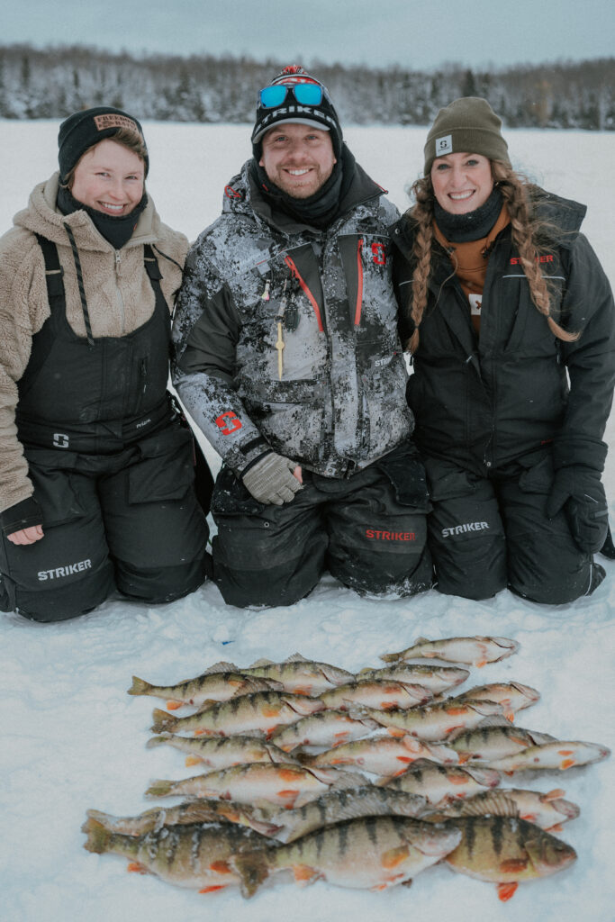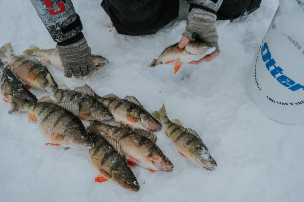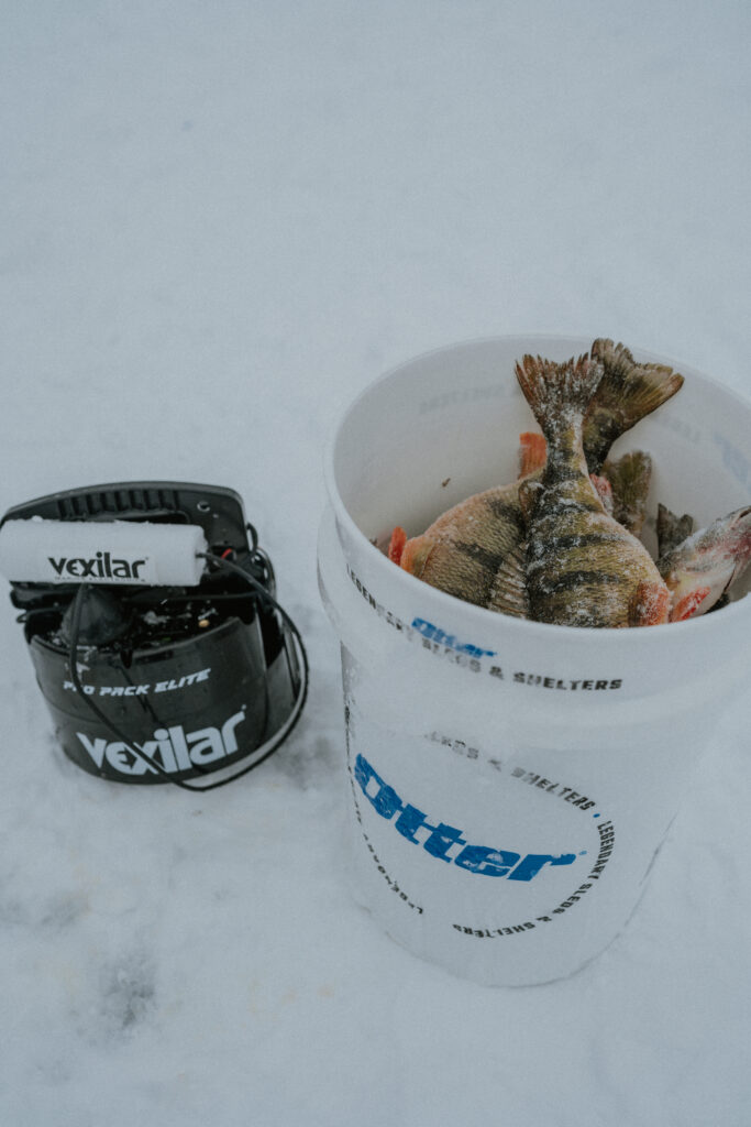 The highlight of the day came when Jay, Taylor, and I all hooked into jumbo perch within minutes of each other. We were running in three different directions, laughing, yelling, and trying to keep up. It was chaotic in the best way, and we definitely had a hot spot within our group setup.